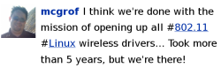 Linux wireless driver veteran Luis R. Rodriguez ("mcgrof") praises Broadcom in a 'dent' on Twitter alternative Identi.ca. He considers this the end of a five-year mission to open source all major 802.11 wireless drivers. In the long-term, this step should also render superfluous a warning against purchasing Broadcom hardware which recently found its way into the wireless driver developer wiki and was mentioned in a recent Kernel Log. Wireless driver developers are currently meeting in San Francisco.