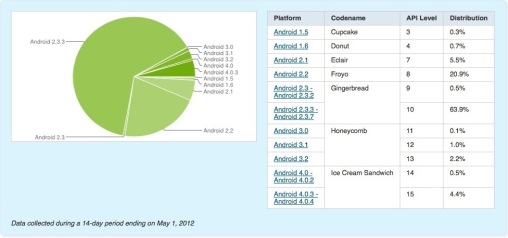 According to recently updated figures from Google, Android devices running version 4.0.x, code-named "Ice Cream Sandwich", of the company's open source mobile operating system are gaining ground. The Platform Versions device dashboard on the Android Developers portal shows that devices running Android 4.0.x now account for almost 5% of the total number of Android devices in use, up from just 2.9% one month ago; these figures are based on the number of Android devices that accessed the company's Android Market within a two week period ending on 1Â May.