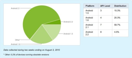 Google has published an updated breakdown of the number of active devices running a given version of its Android mobile operating system platform. According to the Platform Versions device dashboard on the Android Developer portal, nearly 60% of all Android devices in circulation are now running version 2.1 of the OS – up almost 10% compared to mid-June (50%). Android 1.5 and 1.6 devices now make up 15.3% and 20.3% of devices respectively, while only 0.2% of devices are running obsolete versions, including version 1.1, 2.0 and 2.0.1.