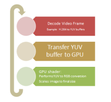 Previously Moonlight, the open source Mono-based Silverlight clone for Linux and other Unix/X11 based operating systems, would decode the video, which decompresses it into video frames, and then generate images in YUV format, after which these would be converted into an in-memory bitmap encoded in RGB format. Finally, it would be transferred to the graphics card.