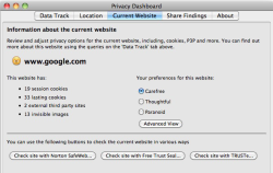 The add-on displays an icon in the Firefox toolbar that acts as an indicator, changing between three states according to what the system knows about the site currently displayed: if it is benign regarding privacy, if it collects some information but does not have a machine readable privacy policy, or, if it enables tracking by third-party web sites. The first time a user visits a web site that is not known to be benign, then the Dashboard alerts the user to set their preferences – there are three choices: "Accept always", "Protect me" and "Tell me more". Selecting the latter option brings up a dialogue box that lists the information that is available, including the number of session cookies, lasting cookies, external third party sites and invisible images. Further information is available other tabs. Once the user is feels they are informed, they then have three options from which to choose: whether to be "Carefree", "Thoughtful" or "Paranoid" regarding the web site.