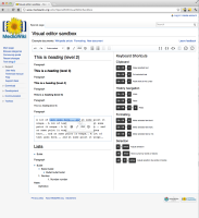 The newly introduced prototype of the visual editor offers a basic user interface for editing articles. It supports a variety of character and paragraph formats and "in the best case scenario" creates valid wiki markup that can be copied directly into an article. The prototype can be tested in the visual editor sandbox.
