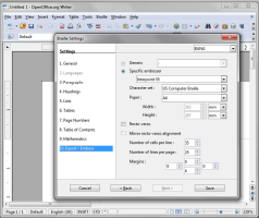 odt2braille supports contracted or uncontracted Braille, supports the layout of most common document units (paragraphs, headings, lists) and can translate formulas into Braille math. The extension also supports the direct entry of Braille, using six keys (S, D, F, J, K and L) which will appear in text or Braille documents as Braille. The developers say the output of odt2braille is well formatted, offers warnings when artefacts of the translation may cause problems, is highly customisable and converts OpenOffice.org to a complete Braille authoring environment.