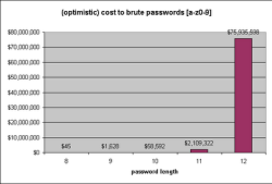A further blog entry from the company notes that cracking long and complex keys is likely to remain too expensive for the foreseeable future. They calculate that cracking a 9 character key which utilises the full range of ASCII characters would cost at least $10 million, rising to 8 billion for a 12 character key. If the password is limited to just letters and numbers, however, the cost drops considerably – a nine character key can be cracked for less than $2,000.