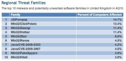 JavaScript-based adware Pornpop was responsible for 14.7% of all malware recorded in the UK – in Germany Pornpop came in at 18.2%. Pornpop opens pop-under advertisements that contain adult content when users visit a specially-crafted web site. The second most common threat in the UK for Q4 2010 was Win32/ClickPotato (13.4%), a program that displays pop-up and notification-style ads based on the user's browsing habits.