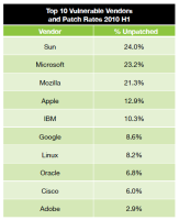The reaction of the 10 vendors, whose products topped the discovered vulnerabilities list, to security experts' disclosures varied a lot. Twenty four per cent of vulnerabilities remained unpatched after six months at Sun Microsystems, with Microsoft just behind in second place at 23.2%. Last year, Microsoft topped the list with 15.8%, while Sun failed to fix just 2.6% of reported vulnerabilities.