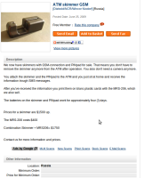 Various "Skimming for Dummies" sets are already available on the internet, offering card slot and keyboard attachments with GSM functionality and even card writers for making counterfeit cards – sometimes for as little as $1,800. However, security blogger Brian Krebs thinks that such products are attempts to trick other petty thieves and no functioning hardware is actually delivered. Krebs says prices for real skimming hardware with GSM, for instance for cash points by NCR, start at around €8,000. According to his report, the GSM feature is provided via dismantled mobile phones that are given larger batteries.