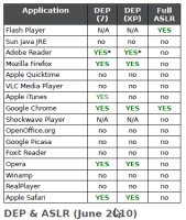 According to an analysis by security firm Secunia, very few applications use the Data Execution Prevention (DEP) and Address Space Layout Randomisation (ASLR) features of Windows which can render attacks on vulnerabilities ineffective. In total, the company looked at 16 popular applications such as browsers, media players and office applications.